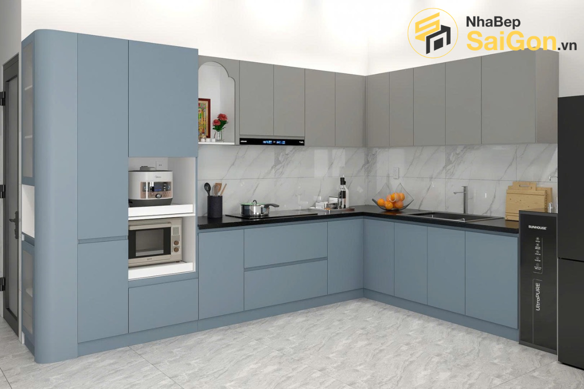 Thiết kế chữ L giúp phân chia rõ ràng ba khu vực chính: khu vực chuẩn bị (bàn bếp, bồn rửa), khu vực nấu nướng (bếp gas/bếp từ, máy hút mùi) và khu vực lưu trữ (tủ bếp trên, tủ bếp dưới, tủ kho). Sự bố trí này tạo thành một "tam giác làm việc" hiệu quả, giúp việc nấu nướng trở nên nhanh chóng và thuận tiện.