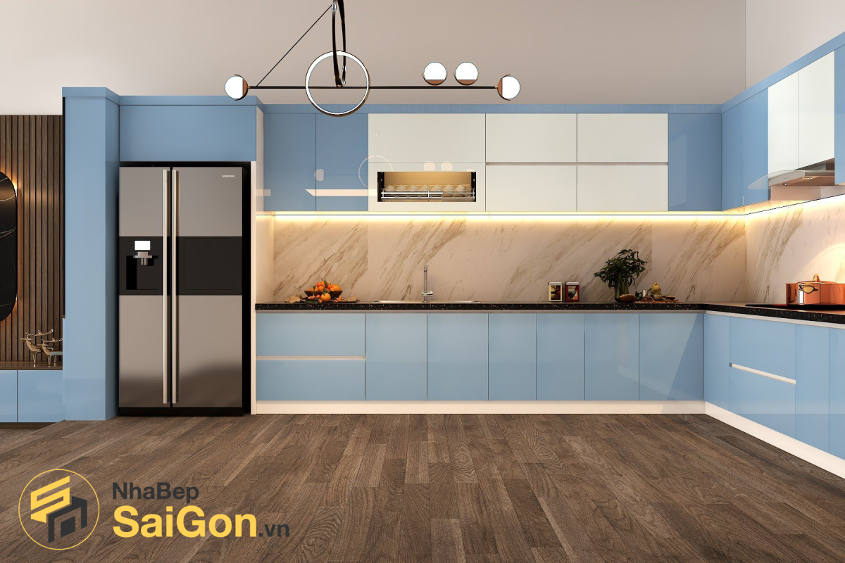 Mẫu tủ bếp chữ L - TBL004 nằm ở tông màu xanh pastel kết hợp trắng thanh lịch, mang lại cảm giác nhẹ nhàng, tươi mới và hiện đại cho không gian bếp. Sự phối hợp màu sắc hài hòa cùng các đường nét thiết kế tối giản giúp tổng thể căn bếp trở nên trẻ trung nhưng vẫn giữ được sự sang trọng cần thiết.