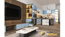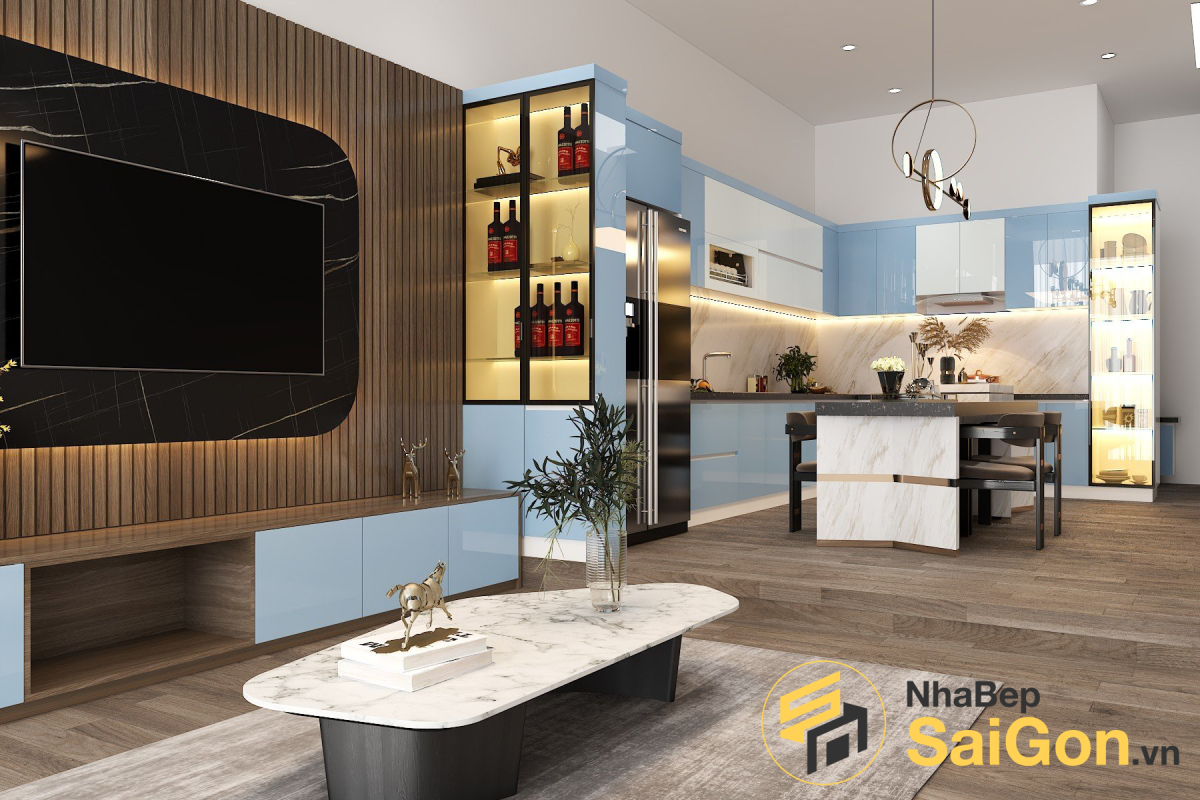 Ngoài hệ tủ bếp chính, thiết kế còn tích hợp tủ trưng bày rượu và kệ trang trí có đèn LED, vừa tăng thêm không gian lưu trữ vừa tạo điểm nhấn thẩm mỹ cho khu vực bếp. Phần bàn đảo kết hợp bàn ăn mang đến sự tiện lợi trong sinh hoạt, có thể dùng để chuẩn bị thực phẩm, thưởng thức bữa ăn nhẹ hoặc làm nơi sum họp của gia đình.