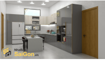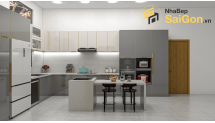 Ngoài hệ tủ bếp chính, thiết kế còn tích hợp tủ trưng bày rượu và kệ trang trí có đèn LED, vừa tăng thêm không gian lưu trữ vừa tạo điểm nhấn thẩm mỹ cho khu vực bếp. Phần bàn đảo kết hợp bàn ăn mang đến sự tiện lợi trong sinh hoạt, có thể dùng để chuẩn bị thực phẩm, thưởng thức bữa ăn nhẹ hoặc làm nơi sum họp của gia đình.