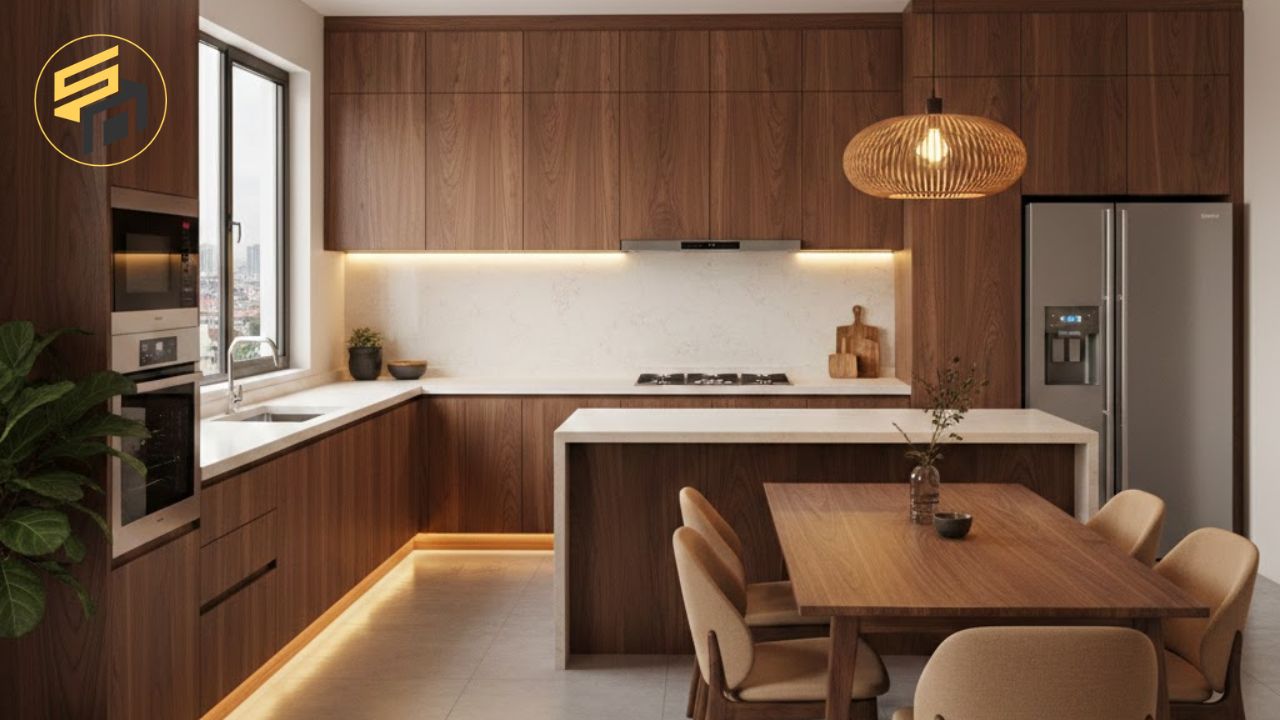 Laminate vân óc chó trên cốt MDF chống ẩm mang đến vẻ sang trọng ấm áp như gỗ tự nhiên nhưng bền bỉ hơn trong môi trường ẩm. Mặt đá quartz trắng kem tạo sự tương phản tinh tế, quầy bar mini giúp kết nối sinh hoạt gia đình. Hệ tủ góc xoay và ngăn kéo giảm chấn tối ưu công năng, phù hợp không gian bếp mở liền phòng khách.