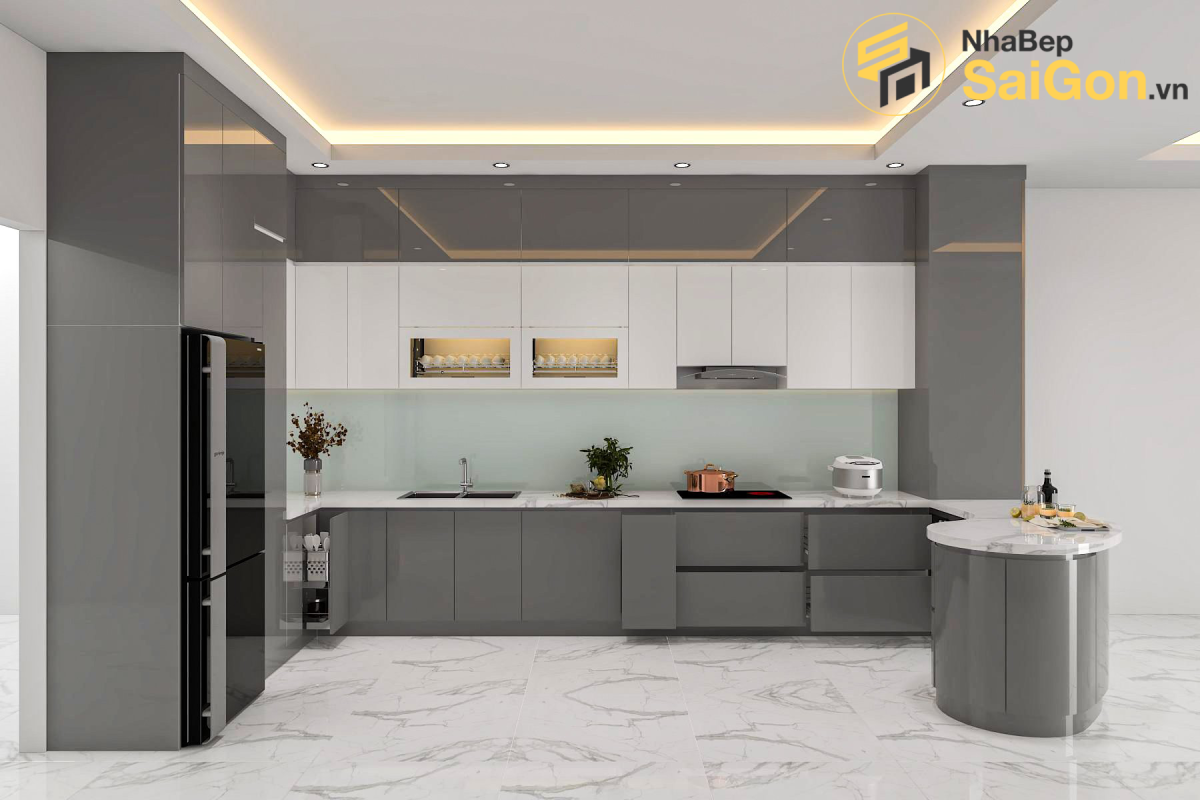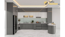 Tổng thể tủ bếp gây ấn tượng với tông màu xám – trắng thanh lịch, phù hợp với nhiều phong cách nội thất hiện đại. Hệ tủ trên màu trắng giúp không gian bếp trở nên sáng sủa, thông thoáng, trong khi hệ tủ dưới màu xám tạo điểm nhấn sang trọng và sạch sẽ. Phần tủ kính trang trí tích hợp kệ úp chén bát có đèn LED không chỉ tăng tính tiện dụng mà còn mang lại hiệu ứng ánh sáng ấm áp, tạo chiều sâu cho không gian bếp.