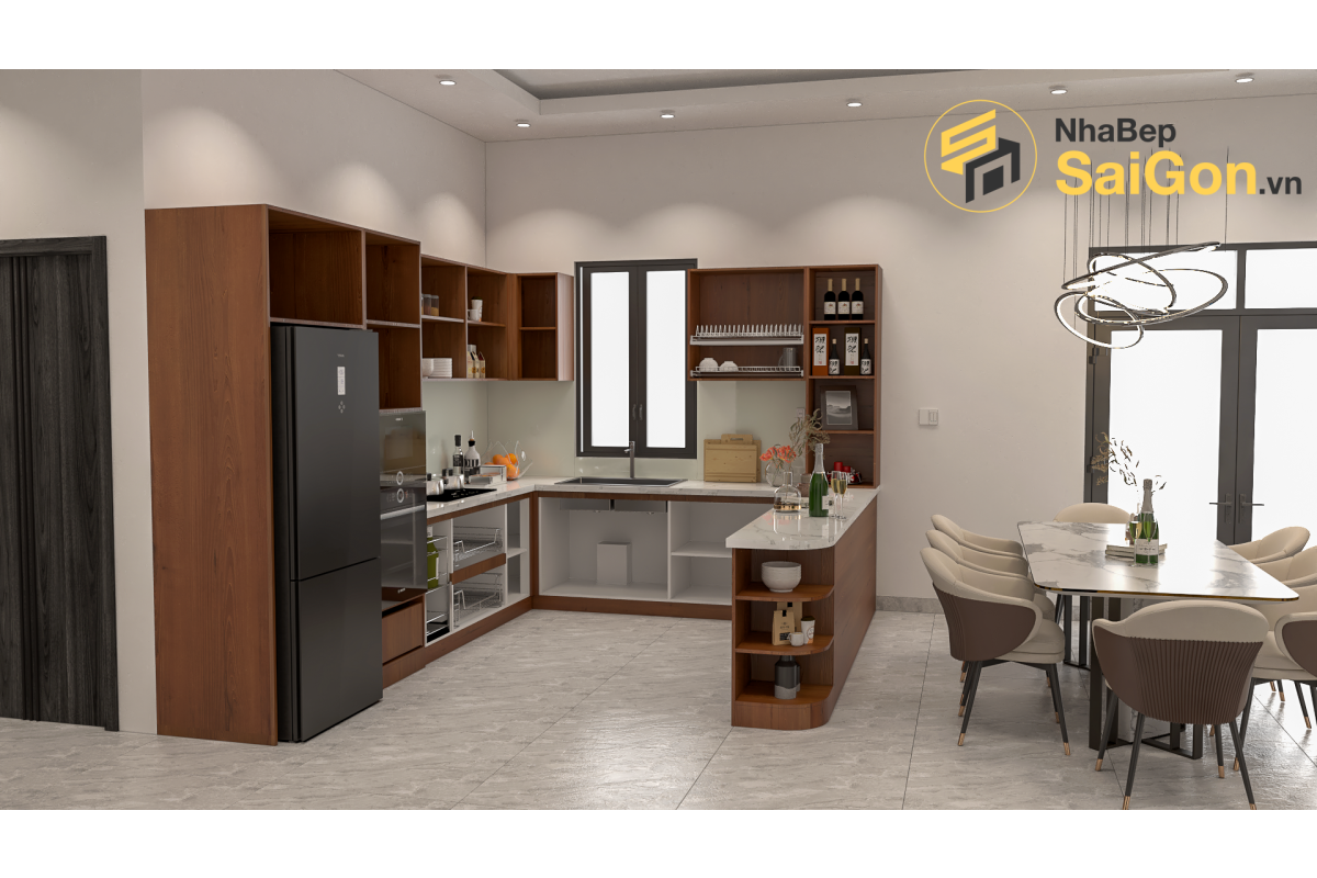 Điểm nổi bật của mẫu tủ bếp chữ U - TBU006 chính là khu vực đảo bếp bo cong mềm mại, vừa đóng vai trò như một bàn chuẩn bị thực phẩm, vừa có thể tận dụng làm quầy bar mini hoặc khu vực bày trí món ăn. Thiết kế này giúp không gian bếp trở nên hiện đại, tiện nghi và mang tính kết nối cao với các khu vực sinh hoạt khác trong nhà.