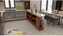 Tổng thể tủ bếp gây ấn tượng với tông màu xám trắng thanh lịch, phù hợp với nhiều phong cách nội thất hiện đại. Hệ tủ trên màu trắng giúp không gian bếp trở nên sáng sủa, thông thoáng, trong khi hệ tủ dưới màu xám tạo điểm nhấn sang trọng và sạch sẽ. Phần tủ kính trang trí tích hợp kệ úp chén bát có đèn LED không chỉ tăng tính tiện dụng mà còn mang lại hiệu ứng ánh sáng ấm áp, tạo chiều sâu cho không gian bếp.