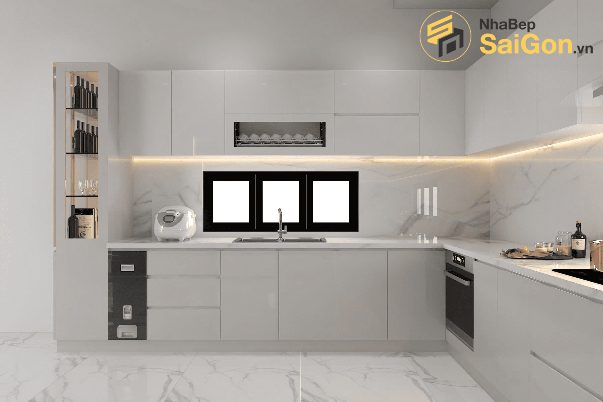 Một số khoang tủ được thiết kế với cánh kính trong suốt, bên trong là hệ thống đèn chiếu sáng. Đây là nơi lý tưởng để trưng bày những bộ ly tách sang trọng, bộ đồ gốm sứ tinh xảo hoặc những món đồ trang trí độc đáo. Tủ kính không chỉ giúp tô điểm thêm vẻ đẹp cho không gian bếp mà còn thể hiện gu thẩm mỹ tinh tế của gia chủ.