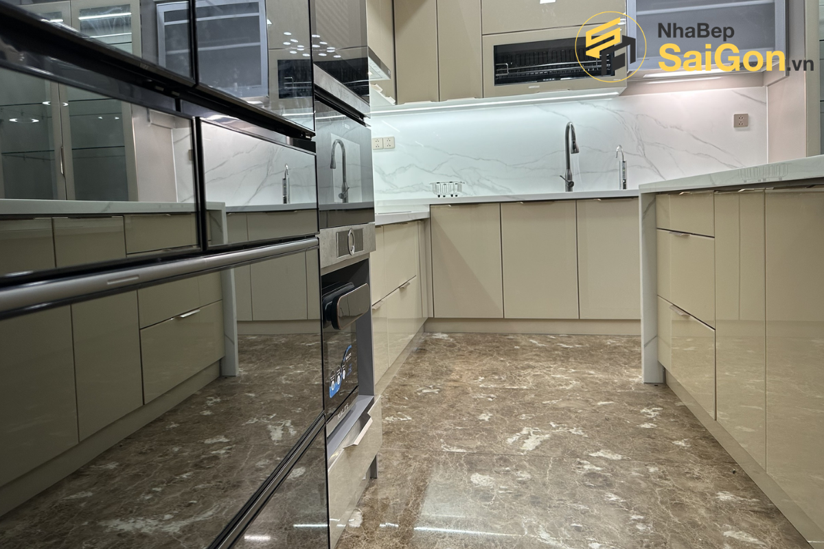 Thiết kế cánh kính cường lực tạo hiệu ứng thị giác hiện đại, sang trọng giúp căn bếp trở nên sáng sủa và có cảm giác rộng rãi hơn. Bề mặt kính dễ dàng lau chùi, giữ cho không gian luôn sạch sẽ, tinh tươm.