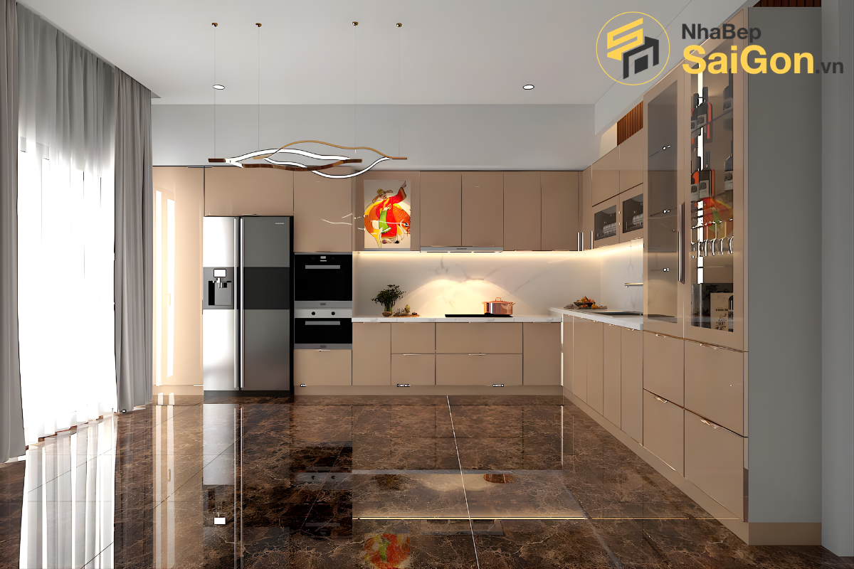 Chiếc tủ bếp chữ L hợp kim nhôm cánh kính nổi bật với vẻ đẹp hiện đại, bề mặt kính phản chiếu ánh sáng, làm bừng sáng cả căn phòng.