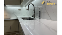 Hệ thống đèn LED chiếu sáng dưới tủ bếp cũng được tích hợp tinh tế, vừa cung cấp đủ ánh sáng cho khu vực làm việc, vừa tạo hiệu ứng thẩm mỹ lung linh, ấm cúng.