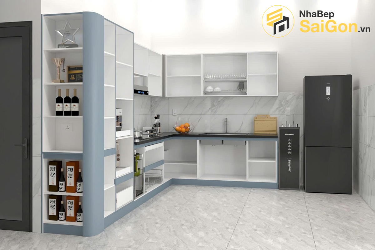 Thiết kế chữ L giúp phân chia rõ ràng ba khu vực chính: khu vực chuẩn bị (bàn bếp, bồn rửa), khu vực nấu nướng (bếp gas/bếp từ, máy hút mùi) và khu vực lưu trữ (tủ bếp trên, tủ bếp dưới, tủ kho). Sự bố trí này tạo thành một "tam giác làm việc" hiệu quả, giúp việc nấu nướng trở nên nhanh chóng và thuận tiện.