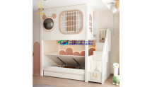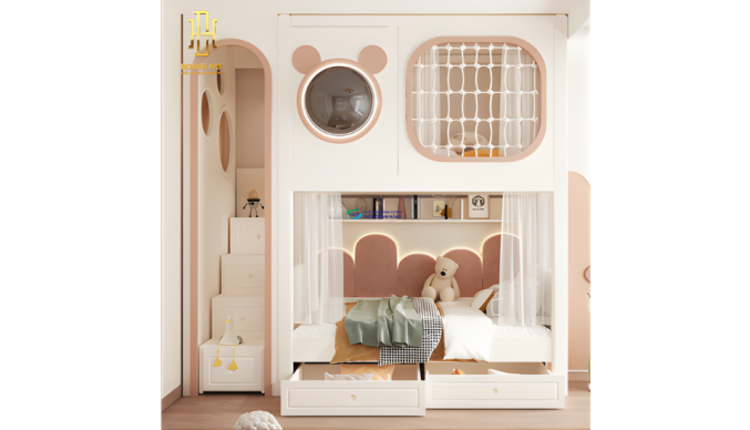Điểm nhấn độc đáo của mẫu GT015 nằm ở khả năng tích hợp đa chức năng. Tầng trên là không gian nghỉ ngơi lý tưởng cho bé, được trang bị thành giường cao chắc chắn đảm bảo an toàn. Tầng dưới có thể tùy biến thành giường phụ hoặc không gian vui chơi, học tập. Đặc biệt, thiết kế còn khéo léo lồng ghép các ngăn kéo, hộc tủ nhỏ xinh xắn dưới gầm giường và cầu thang lên xuống, tạo ra không gian lưu trữ thông minh cho quần áo, đồ chơi hay sách vở của bé. Cầu thang lên xuống không chỉ an toàn mà còn có thể được thiết kế kèm các ngăn kéo, tận dụng tối đa mọi khoảng trống.