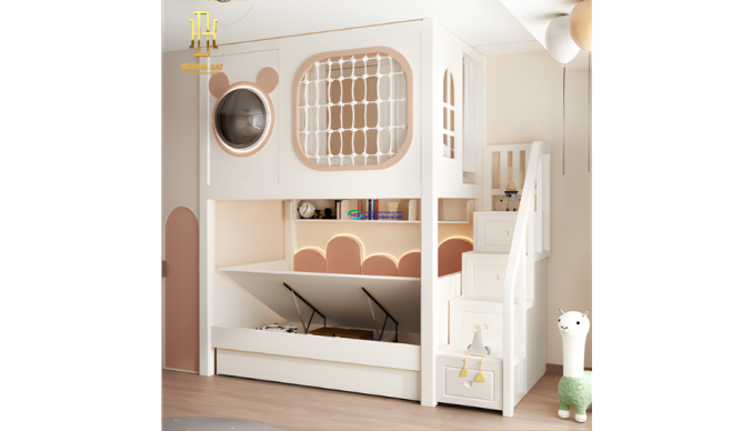 Không chỉ là giường ngủ, sản phẩm còn tích hợp không gian học tập, vui chơi và lưu trữ, đáp ứng mọi nhu cầu của trẻ.