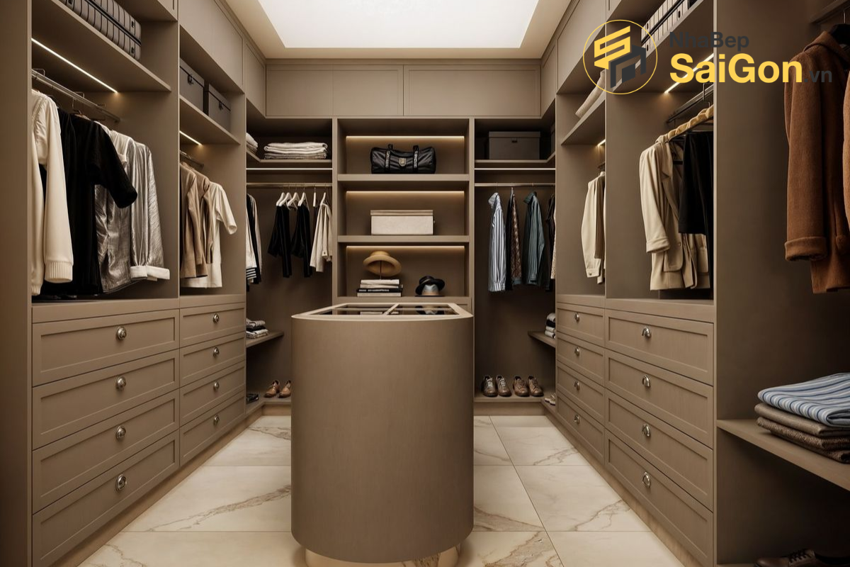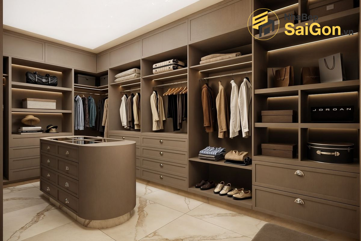 Mẫu Phòng thay đồ PTD009 được thiết kế với sự chú trọng đặc biệt vào việc tối ưu hóa không gian lưu trữ. Hệ thống tủ kệ được bố trí khoa học, phân chia rõ ràng cho từng loại trang phục, phụ kiện, giày dép. Các ngăn kéo trượt êm ái, hộc tủ âm tường, thanh treo đồ linh hoạt giúp bạn dễ dàng sắp xếp và tìm kiếm mọi thứ một cách nhanh chóng. Bên cạnh đó, việc tích hợp các ngăn chứa chuyên dụng cho trang sức, cà vạt, thắt lưng, túi xách góp phần nâng cao tính tiện dụng và đẳng cấp cho không gian.