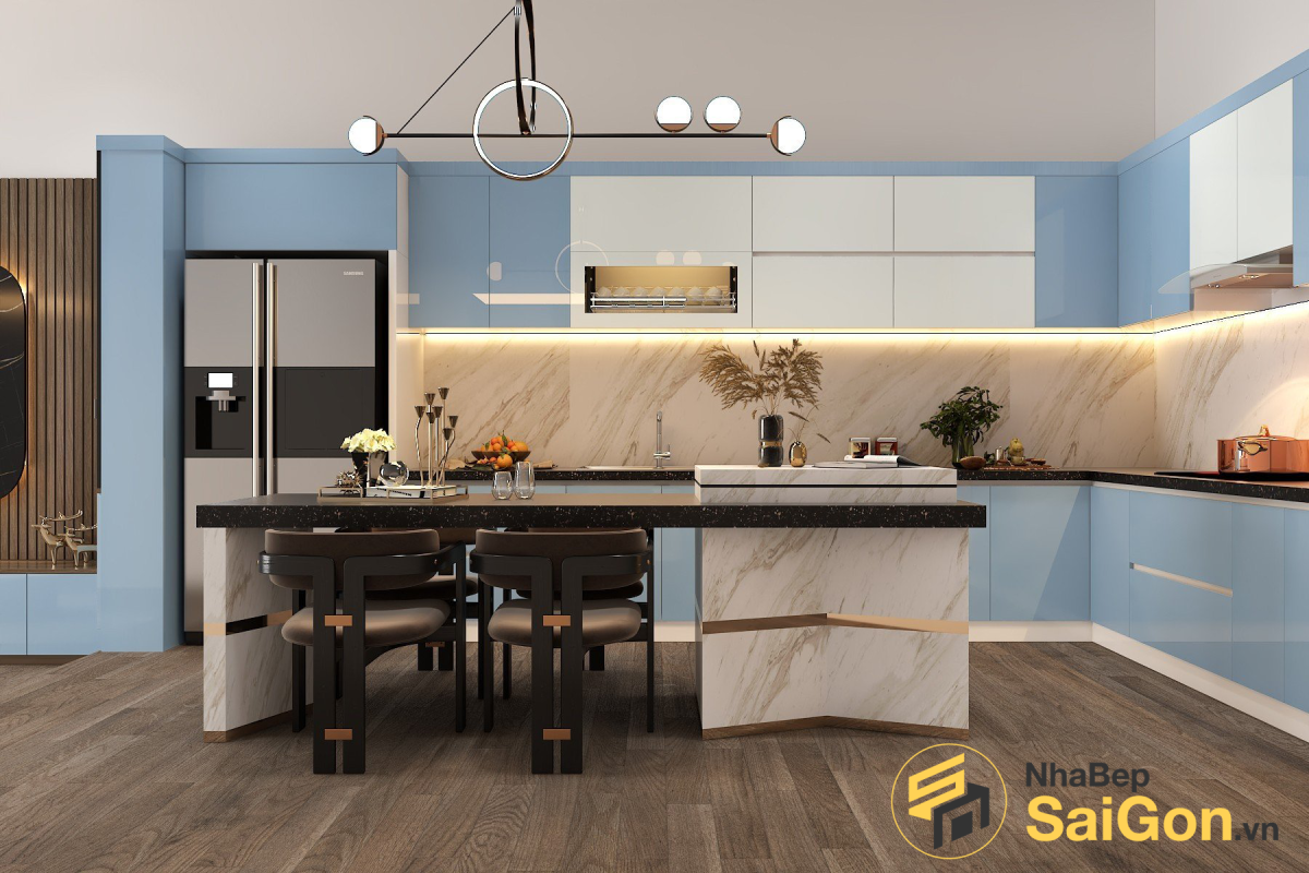 Mẫu tủ bếp chữ L - TBL004 nằm ở tông màu xanh pastel kết hợp trắng thanh lịch, mang lại cảm giác nhẹ nhàng, tươi mới và hiện đại cho không gian bếp. Sự phối hợp màu sắc hài hòa cùng các đường nét thiết kế tối giản giúp tổng thể căn bếp trở nên trẻ trung nhưng vẫn giữ được sự sang trọng cần thiết.