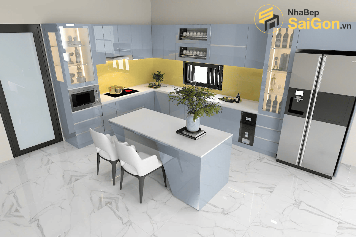 Phần đảo bếp kết hợp bàn ăn là điểm nhấn nổi bật của mẫu TBL038. Thiết kế này không chỉ mở rộng không gian chuẩn bị thực phẩm mà còn có thể sử dụng như một bàn ăn nhỏ, quầy bar mini hoặc khu vực trò chuyện, kết nối giữa các thành viên trong gia đình. Mặt đá tối màu tương phản với phần thân đảo bếp tạo nên sự sang trọng và hiện đại cho toàn bộ không gian.