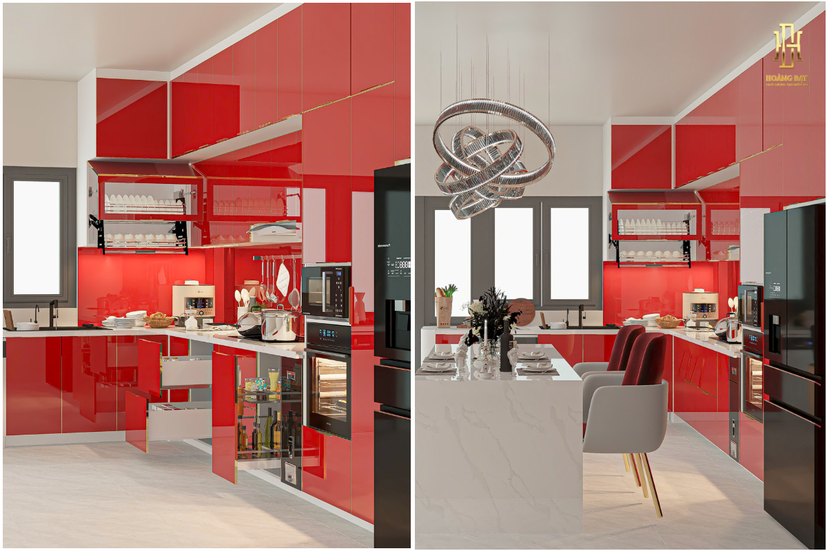 Với hai dãy tủ kéo dài theo hai bức tường vuông góc, tủ bếp chữ L cung cấp một không gian lưu trữ rộng rãi. Bạn có thể đặt nhiều ngăn kéo, kệ, hộc tủ để chứa đựng đa dạng các dụng cụ nhà bếp, thực phẩm khô, bát đĩa, xoong nồi... Việc sắp xếp khoa học các vật dụng này giúp gian bếp luôn gọn gàng, sạch sẽ, dễ dàng tìm kiếm khi cần sử dụng.