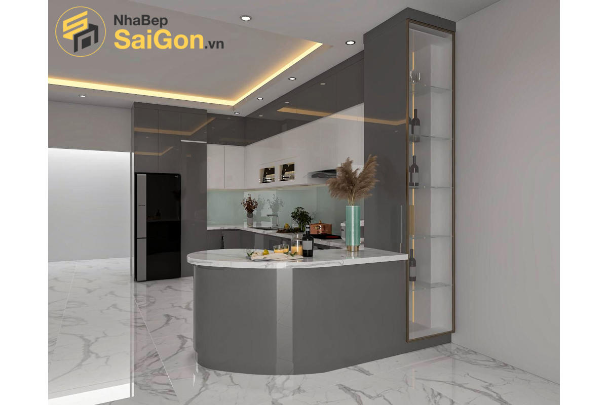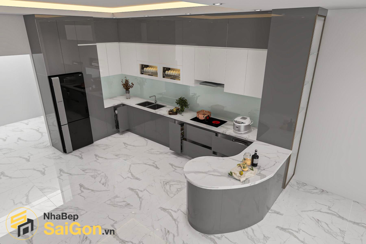Tổng thể tủ bếp gây ấn tượng với tông màu xám – trắng thanh lịch, phù hợp với nhiều phong cách nội thất hiện đại. Hệ tủ trên màu trắng giúp không gian bếp trở nên sáng sủa, thông thoáng, trong khi hệ tủ dưới màu xám tạo điểm nhấn sang trọng và sạch sẽ. Phần tủ kính trang trí tích hợp kệ úp chén bát có đèn LED không chỉ tăng tính tiện dụng mà còn mang lại hiệu ứng ánh sáng ấm áp, tạo chiều sâu cho không gian bếp.