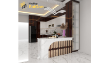 Mặt bếp được thiết kế rộng rãi với vật liệu bền đẹp, dễ vệ sinh, đáp ứng tốt nhu cầu nấu nướng của gia đình. Các thiết bị bếp như bồn rửa, bếp nấu và tủ lạnh được bố trí hợp lý theo nguyên tắc tam giác bếp, giúp tối ưu thao tác và tiết kiệm thời gian di chuyển khi sử dụng.