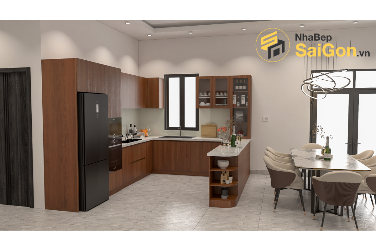 Điểm nổi bật của mẫu tủ bếp chữ U - TBU006 chính là khu vực đảo bếp bo cong mềm mại, vừa đóng vai trò như một bàn chuẩn bị thực phẩm, vừa có thể tận dụng làm quầy bar mini hoặc khu vực bày trí món ăn. Thiết kế này giúp không gian bếp trở nên hiện đại, tiện nghi và mang tính kết nối cao với các khu vực sinh hoạt khác trong nhà.