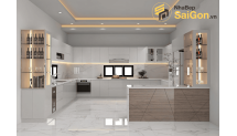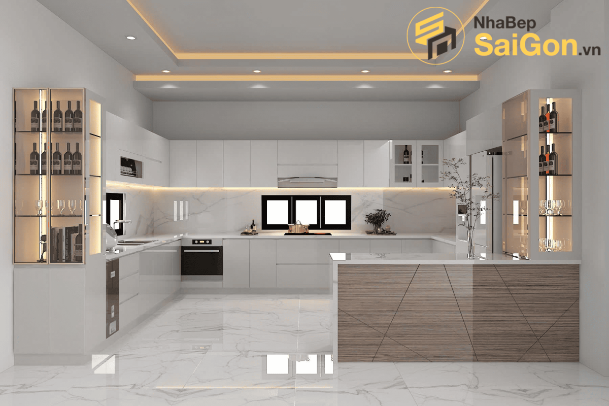 Một số khoang tủ được thiết kế với cánh kính trong suốt, bên trong là hệ thống đèn chiếu sáng. Đây là nơi lý tưởng để trưng bày những bộ ly tách sang trọng, bộ đồ gốm sứ tinh xảo hoặc những món đồ trang trí độc đáo. Tủ kính không chỉ giúp tô điểm thêm vẻ đẹp cho không gian bếp mà còn thể hiện gu thẩm mỹ tinh tế của gia chủ.