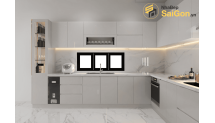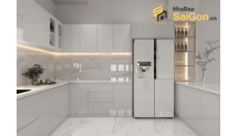Mẫu tủ bếp này được trang bị các phụ kiện cao cấp như bản lề giảm chấn, ray trượt âm, tay nắm tủ,... đảm bảo hoạt động êm ái, bền bỉ và an toàn. Những chi tiết nhỏ này góp phần tạo nên trải nghiệm sử dụng tiện lợi, thoải mái và không gây tiếng ồn khó chịu.